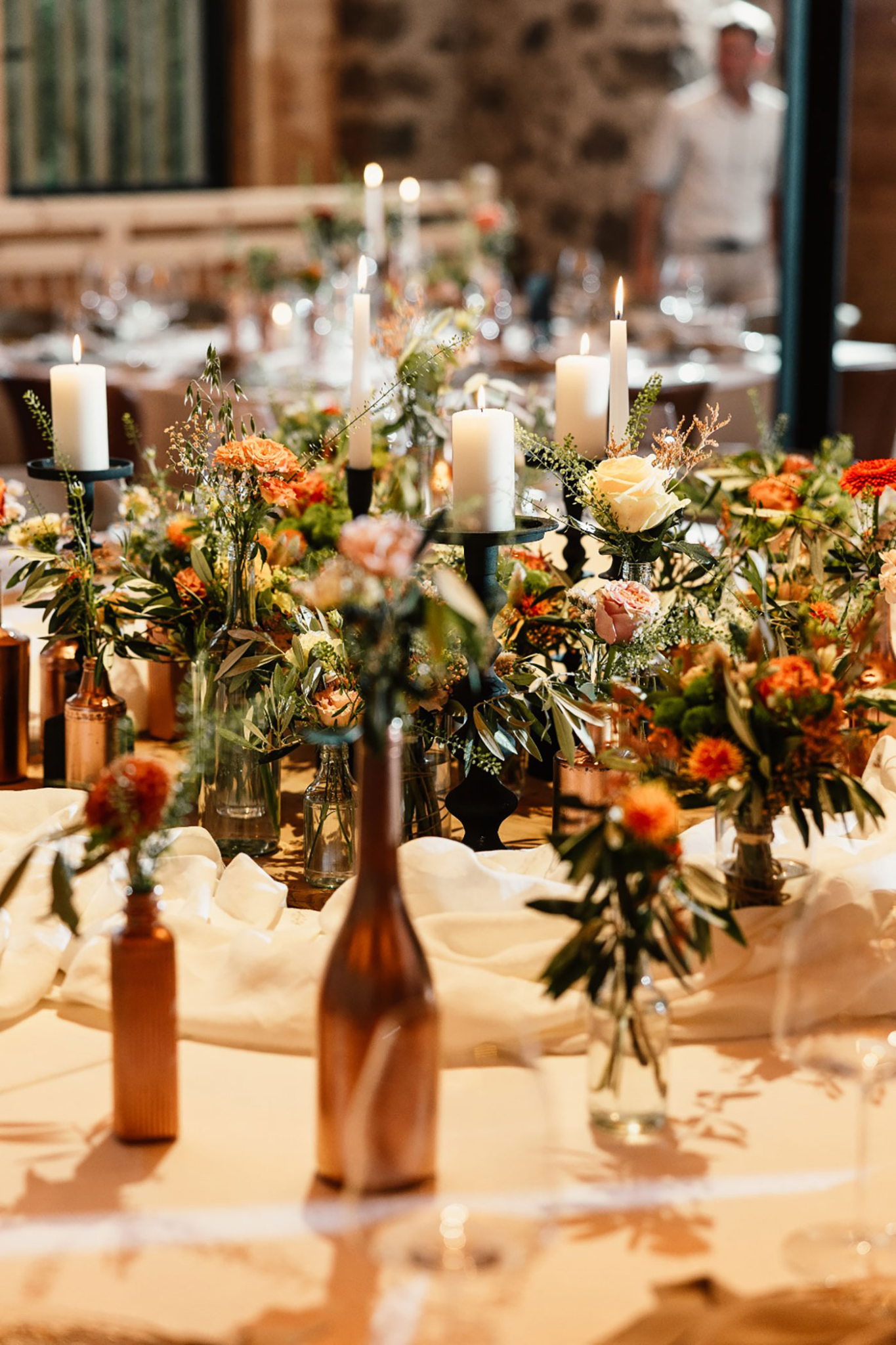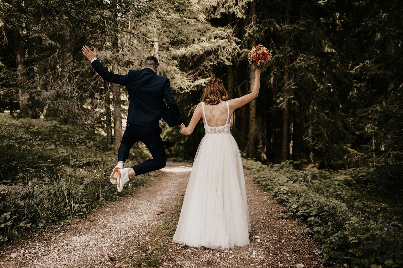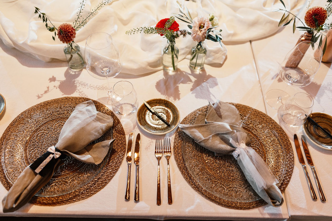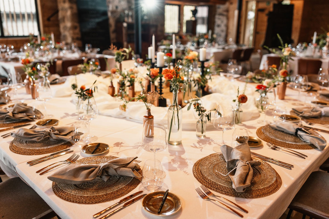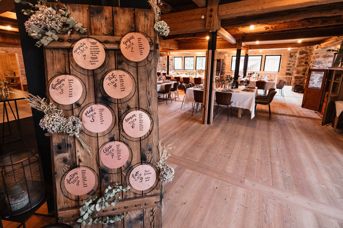 Besonders die liebevoll gestaltete Tischdekoration spiegelte den Charakter der Hochzeit wider: Viele kleine Vasen mit Wiesenblumen, zarte Orangetöne und warmes Kerzenlicht schufen eine stilvolle, aber zugleich natürliche Kulisse für das gemeinsame Dinner. In Kombination mit dem rustikalen Ambiente der Tilia entstand eine einzigartige Stimmung, die diese Hochzeit im Grünen in Südtirol zu etwas ganz Besonderem machte. Zwischen Garten, Natur und stilvollem Ambiente wurde dieser Tag zu einem unvergesslichen Fest voller Emotionen, Leichtigkeit und persönlicher Momente – genau das, was eine Boho Hochzeit ausmacht.